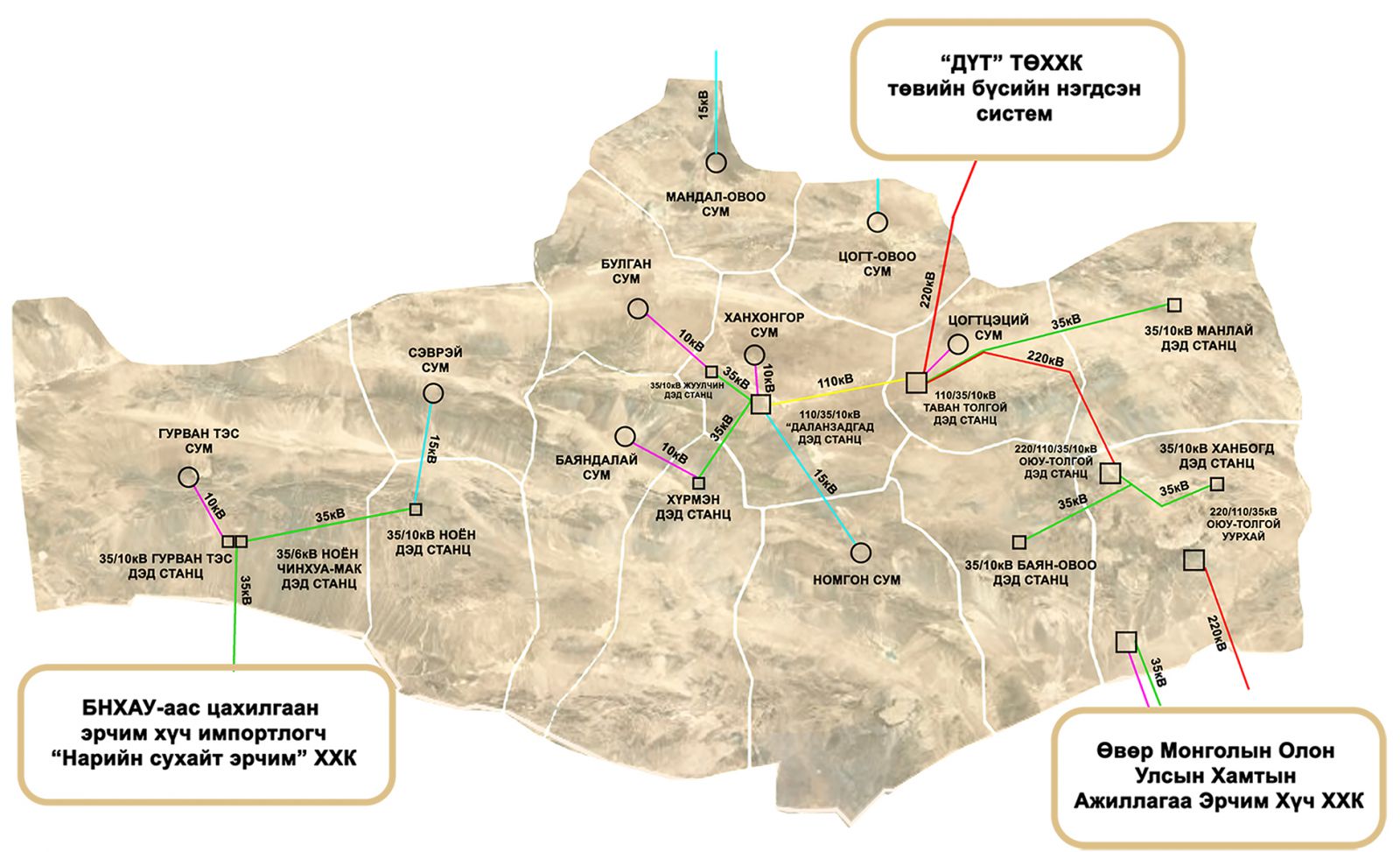 БНХАУ-ын ӨМОУХАЭХ ХХК-иас тус тус цахилгаан эрчим хүчийг хүлээн авч Гашуун сухайт хилийн боомт болон Өмнөговь аймгийн 13 сумыг хамран аймгийн төвөөс урагш 110км, хойшоо 160км, баруун, зүүн тийш тус бүр 320-360км алслагдсан зайд нийт 152.4 мянган хавтгай дөрвөлжин километр нутаг дэвсгэрт тоолуурын цэгийн тоогоор 26126 хэрэглэгчдэд цахилгаан эрчим хүчийг түгээх, хангах үйл ажиллагааг хариуцан ажиллаж байна.