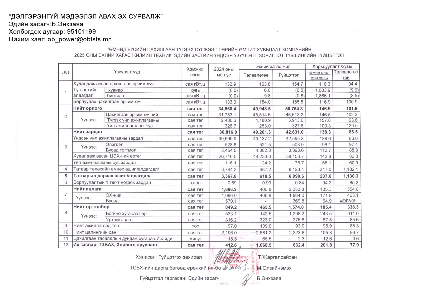 2025 ОНЫ ЭХНИЙ ХАГАС ЖИЛИЙН ТЕХНИК, ЭДИЙН ЗАСГИЙН ҮНДСЭН ҮЗҮҮЛЭЛТ, ЗОРИЛТОТ ТҮВШИНГИЙН ГҮЙЦЭТГЭЛ