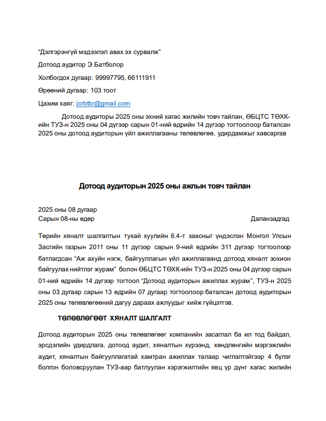 Дотоод аудит, санхүүгийн хяналт шалгалтын тайлан, акт, дүгнэлт, албан шаардлага, зөвлөмж